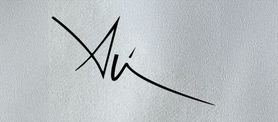 İmza bir jesttir; jest ise iç titreşimin en saf formu. Bu imzada acele yok, ama iç patlama var. Çizginin incelip kalınlaştığı yerler, tabloların fırça darbelerinin psikolojik izlerini taşır. Kâğıt üstünde uzayan o uzun kuyruk, suda kaybolan bir balığın belirsiz izi gibi sürer. Bu, bitiş değil, devam jestidir; yarın tekrar atılacak bir imzanın haberi gibi.