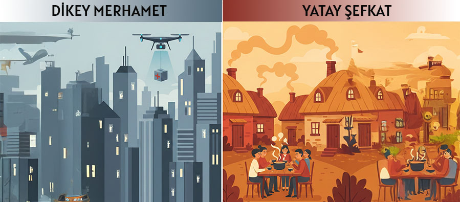 Şefkat ise yatay, yan yana, mahrem ve uzun soluklu bir varoluş tarzıdır. Acıyı uzaktan seyretmez; acının yanına yerleşir, yükü paylaşır, ilişkiyi bağa dönüştürür. Duygusal değil, varoluşsal bir sadakat biçimidir; gösteri istemez, tanık aramaz, fotoğraf sevmez. Şefkatin politik ve toplumsal alanı küçük topluluklardır: aile, mahalle, cemaat, komünal dayanışma ağları. Toplumsal hafızayı onaran, travmayı işleyen, uzun vadeli barışı mümkün kılan da merhamet değil şefkattir.