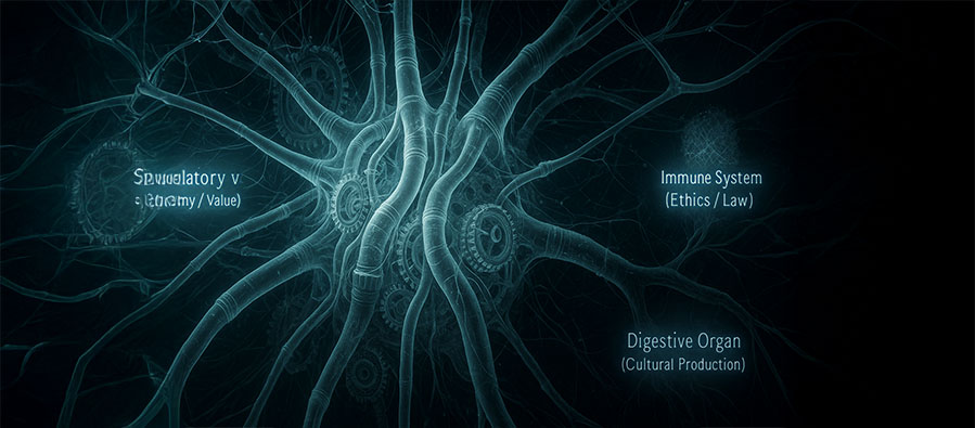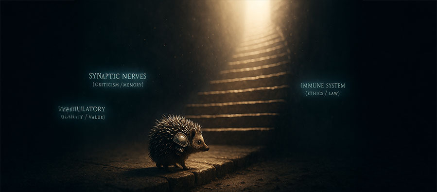 [5] Neo-Toplumsal Organoloji, metninin bağlamında toplumu artık “kurumların toplamı” ya da “bireylerin soyut etkileşimi” olarak değil; farklı ritimlerde çalışan, birbirini tamamlayan ya da sabote eden organlardan oluşan dinamik bir canlı beden olarak okuyan radikal bir çerçevedir. Bu yaklaşım, Gilbert Simondon’un bireyleşme düşüncesini, Bernard Stiegler’in organoloji kavramını ve Heterobilim Okulu’nun sinaptik-toplumsal akış modelini aynı potada eriterek; toplumu sinir sistemleri (iletişim, hafıza, eleştiri), dolaşım sistemleri (ekonomi, emek, değer akışları), bağışıklık sistemleri (hukuk, etik metabolizma), solunum ağları (kamusal alan, ifade özgürlüğü), sindirim organları (kültürel üretim, ritüeller, hikâye anlatımı) gibi işlevsel katmanlar üzerinden yeniden tasnif eder. Neo-Toplumsal Organoloji’nin iddiası, sadece bir metafor sunmak değildir; metinde vurgulanan praksiyolojik dönüşümle birleştiğinde, toplumun nerede nefes darlığı çektiğini, nerede ritim bozukluğu yaşadığını, hangi organların nekroza uğradığını ya da hangi dokuların kendini yenileyebildiğini teşhis etmeyi ve buradan yeni bir siyasal-etik mimari kurmayı mümkün kılar. Heterobilim Okulu açısından bu organoloji, eleştirinin biyopolitik bir anatomiye dönüşmesidir; toplumun bedenini kesip biçen değil, ona yeni bir sinirsel uyum kazandıran bir düşünme biçimi. Filozof Kirpi: “Toplumu anlamak için haritalar yetmez; onun atan nabzını, titreyen sinirlerini ve tıkanan damarlarını duymayı bilmek gerekir.”