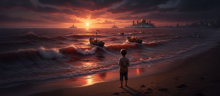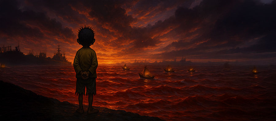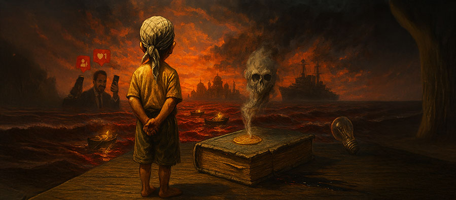 Ve biz, bu görselin önünde dururken, aslında kendi çürümüşlüğümüzle yüzleşiyoruz. Çünkü asıl sorun İsrail’in zulmü kadar, bu zulme karşı yükselmeyen çığlıklarımız, ikiyüzlü politikacılarımız, lüks içinde ahlak satan ulema taklitlerimizdir. “İhanet, sessizlikten yapılmış bir mezardır.” Hanzala’nın denize bakışı, işte tam da bu mezarın kıyısında duruştur. Bir çocuğun yüzü görünmez, çünkü aslında bizim yüzsüzlüğümüzü yansıtır. Güneş batarken yalnızca bir gün değil, bütün bir çağ gömülür: çürümüş ümmet çağının utanmaz sessizliği. Ve biz, bu batışın seyircisiyiz; çürümüşlüğümüzü alkışlamasak da, sahneden ayrılmaya cesaret edemeyen zavallı figüranlarız.