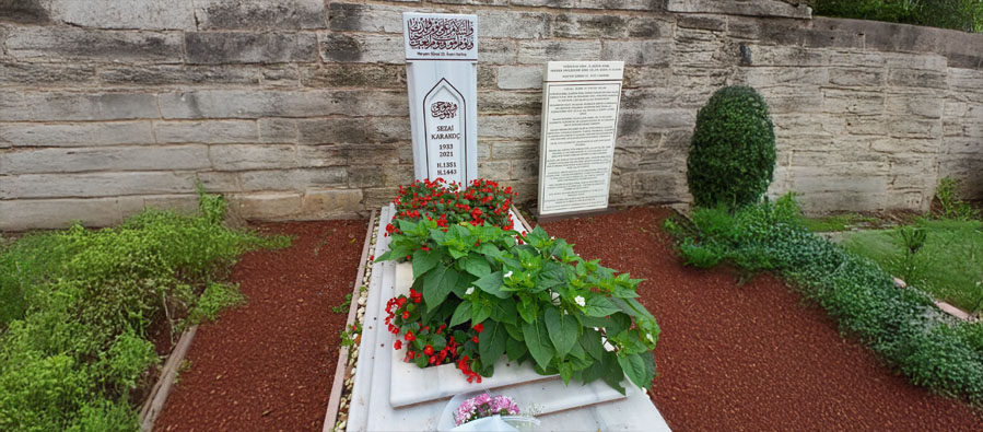 Taş duvarlarla çevrili bu sakin avluda duran kabir, yalnız bir istirahat yeri değil; Sezai Karakoç’un şiirinin, diriliş felsefesinin ve şehir hafızasının somutlaştığı bir eşik gibi görünür. Fotoğrafta toprağı örten kırmızı dokunun üzerinde yükselen yeşil yapraklar ve kırmızı çiçekler, Karakoç’un “ölümde bile dirilen hayat” düşüncesini hatırlatır. Mermerin sadeliği ve duvarın asırlık dokusu, onun şiirindeki zaman anlayışını çağrıştırır: geçmiş ve şimdi, aynı sükûnetin içinde buluşur. Bu mekân, hem bir şairin hatırasını hem de bir düşünürün kurduğu diriliş idealini taşır. Çiçeklerin canlılığı, Karakoç’un medeniyet, ruh ve hakikat üzerine kurduğu söylemin hâlâ nefes aldığını hissettirir. Kabrin önündeki bilgilendirme levhası bile “okunacak metnin” yalnızca taşta değil, mekânın bütün dokusunda saklı olduğunu anlatır. Fotoğraf, zamanı ağırlaştıran bu küçük avluda, Karakoç’un şiirinin mekâna sinmiş izlerini görünür kılar: sessiz ama güçlü, yalın ama derin. Böylece kabir, hem bir son hem de bir çağrıya dönüşür; şiirin, hafızanın ve diriliş fikrinin toprağın altından yeniden filizlenişini taşır.