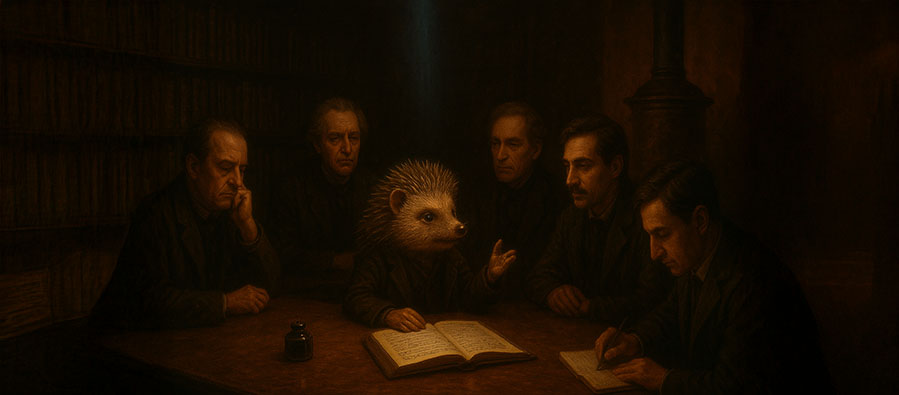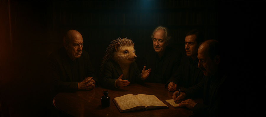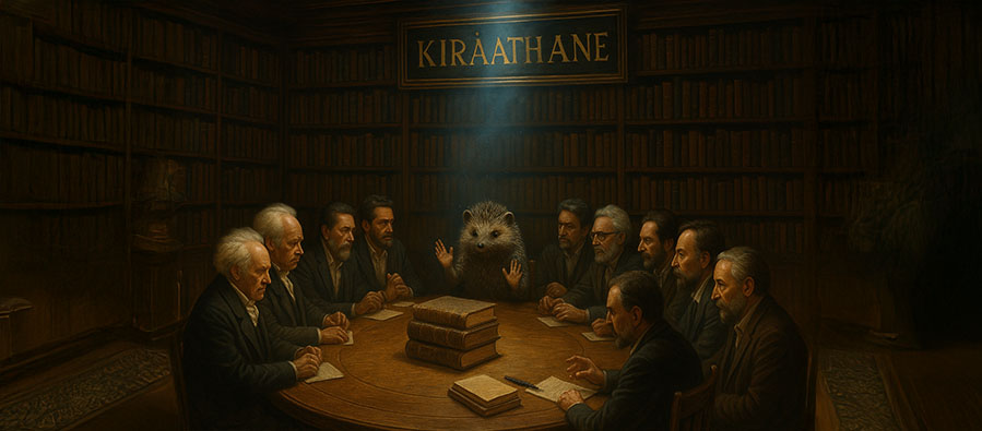 Mühür vuruldu; şimdi kıvılcımın mekâna yerleştiği yere, dikenlerin ince geometriyle parladığı sahneye giriyoruz. Az önce masada nefes alan o cumhuriyet—sözün kanun, itirazın hak, merakın yürütme olduğu—şimdi bir orkestraya dönüşüyor: Schopenhauer kontrbastan karanlık bir hat çekiyor, iradenin kör akıntısını dipten sürüyor; Foucault, ışıkları tavandan indiren bir sahne teknisyeni gibi iktidarın gizli kablolarını işaretliyor; Derrida yaylıların arasına mizaçlı bir “gecikme” sokup işaretlerin sinirini çekiyor; Kristeva, dışlananın dönüşünü obua sesiyle içimize üflüyor; Marx bakır üflemelilerde emeğin ritmini, cebimizdeki delikleri gösteriyor; Heidegger sahnenin tahtasına “yer” diye bir not düşüp varlığın evinde yankıyı ayarlıyor; Hölderlin ölçüyü göğün nabzına bağlıyor; Kemal Tahir, Anadolu’nun ince sazını romana bağlayıp meydanı topluyor; Attilâ İlhan, sokağın pasını cazın yanık notasına çeviriyor; Sezai Karakoç, derin bir çanı vurup iç disiplini hatırlatıyor; İsmet Özel trampetle öfkeyi hizaya sokuyor; Baykan Sezer ve İdris Küçükömer, “kendi kavramlarınla düşün” diyerek bütün partisyonu yerli eksene çiviliyor. Ve bütün bu şamata—pardon, şen bilim—bir moderatörün, Filozof Kirpi’nin serinkanlı elinde demokratik bir tartışmaya kilitleniyor: söz hakkı eşit, kanıt zorunlu, polemik meşru, kişiselleştirme yasak. Net söylüyorum: burada “ego” değil “ekosistem” var.
