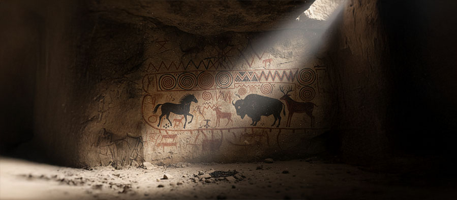 Paleolitik mağaraların duvarlarına kazınan motifler bu sezginin en eski tanıklarıdır. Daireler, zikzaklar, spiraller… Bunlar yalnızca süs değil, zihnin kendi üzerine kapanmadan önceki ilk kayıtlarıdır. Avın ritmi, suyun akışı, göğün dönüşü bu işaretlere kodlandı. Görsel forma dönüştürülen bu devinimler, aslında bir tür ilk tarih yazımıydı. Bugün Lascaux’da[5] ya da Altamira’da[6] karşılaştığımız figürler, yalnızca bir estetik oyun değil; yaşamla kurulan ritmik ilişkinin mekânda ifadesi, varoluşun kaydıdır. İnsan, mağaranın duvarını bir tuvale dönüştürürken aynı zamanda mekânı bir hafıza odasına çevirdi. Mekân, bu işaretlerle birlikte yalnızca barınak değil, aynı zamanda hatırlamanın aracına dönüştü.